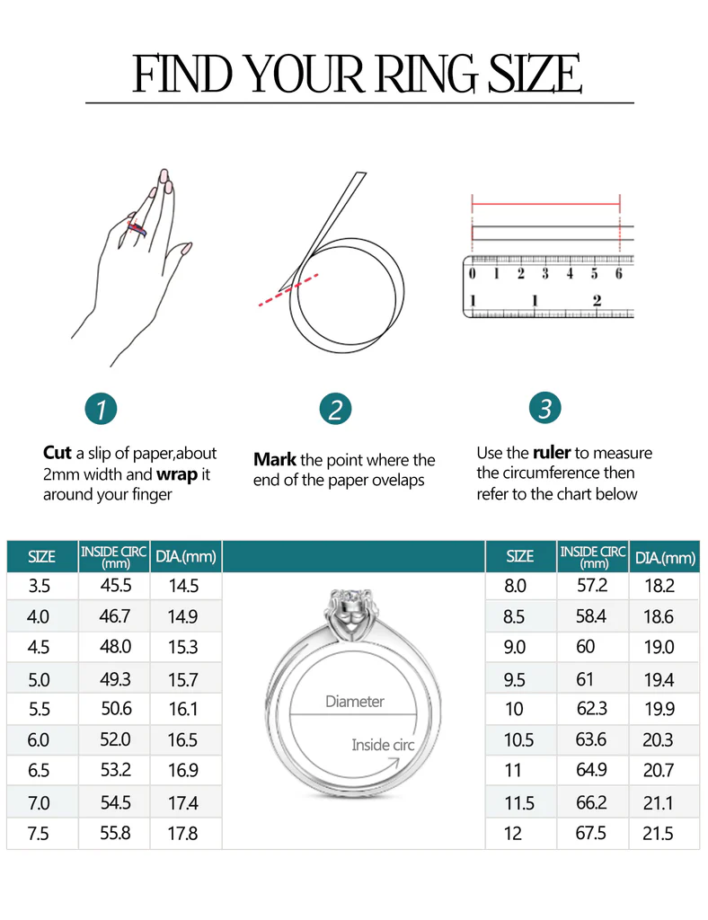 When buying rings online, choose your ring size from a chart. The experience can be cumbersome, especially if your purchase is significant, such as an engagement ring or couple rings to surprise your loved one. Online ring size guides vary around the world. SJJ ring sizes are based on the inner circumference of the ring and range from 48 (diameter: 15.3 mm) to 60 (diameter: 19.1 mm). You can easily identify the corresponding UK or US size from the chart.